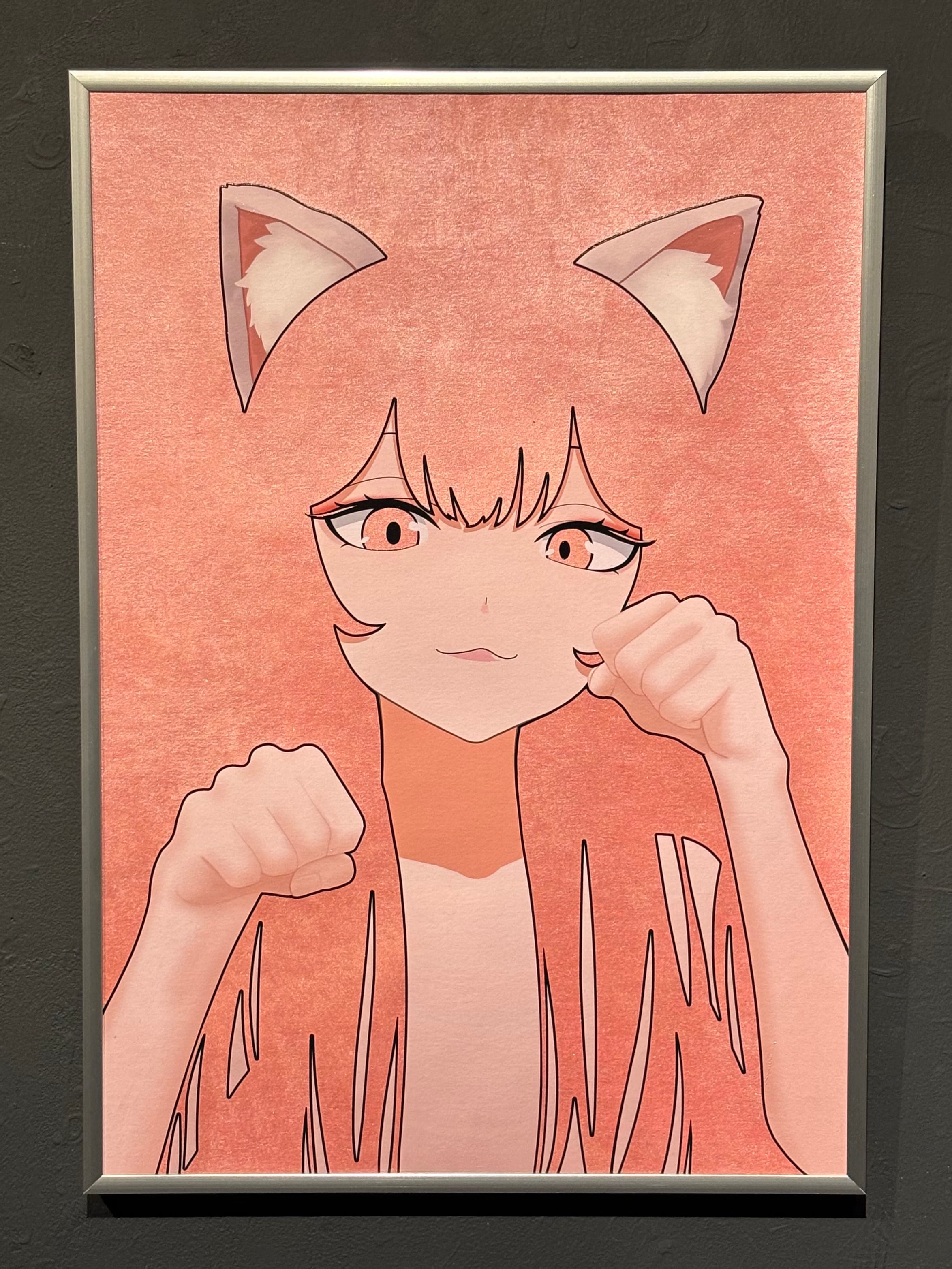 作家コメント:この特殊塗料が施された用紙を見たとき「温かみ」「無邪気さ」を見出しました。いろいろラフを描いてみたとき、猫耳の女の子がこちらを見ている、というのが思い浮かび制作しました。